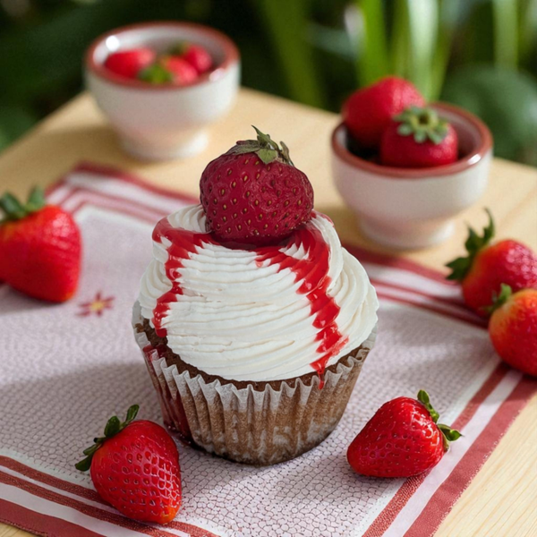 Cupcake moelleux, garni d’une compotée de fruits et d’un coulis délicat.