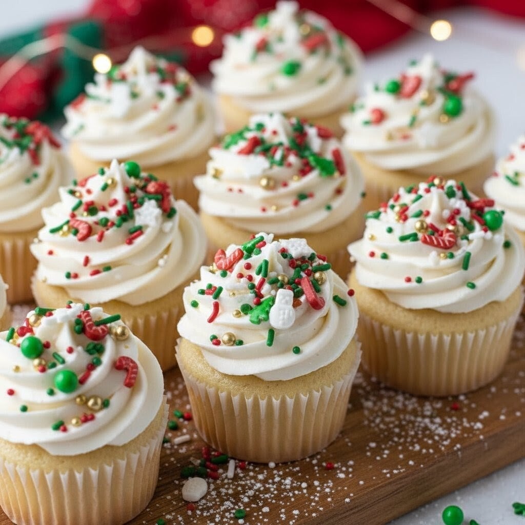 Décorés d’une crème au beurre blanche et de petits bonbons décoratifs festifs.