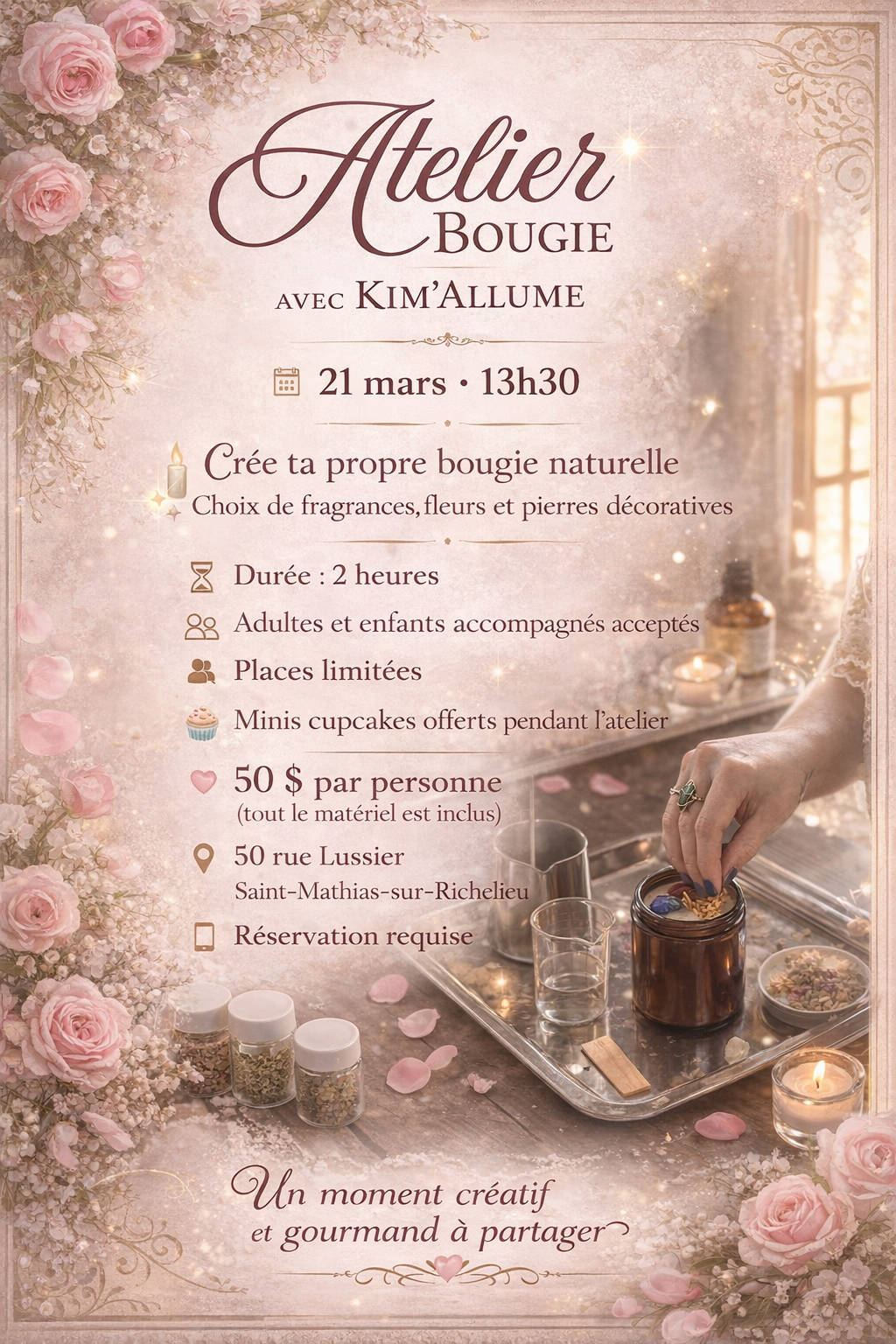 Une activité créative pour tous 🕯️🌿 En collaboration avec Kim’Allume, venez fabriquer votre propre bougie naturelle et personnalisée.