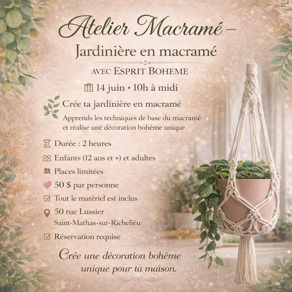 Venez découvrir l’art du macramé lors de cet atelier créatif et convivial. Vous apprendrez les techniques de base pour réaliser votre propre jardinière en macramé dans un style bohème.